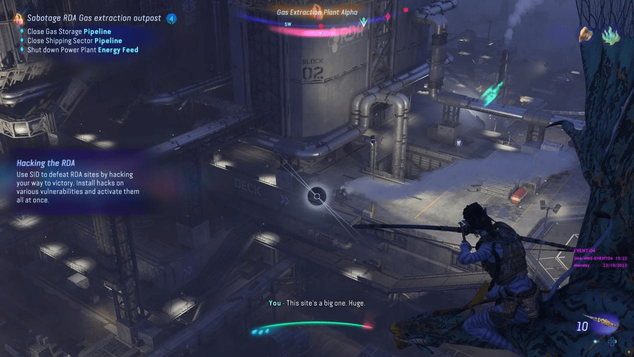 在试玩的最后阶段,玩家需要去攻打一处RDA的据点,而攻下这个据点的条件,是让玩家先破坏据点内的三处设施,最后再到据点的顶端完成一个并不算难的机关解谜任务。如果你之前有玩过育碧的《孤岛惊魂6》,想必你也会发现二者的体验几乎如出一辙——它们同样可以让你在枪械武器和弓箭中来回切换,灵活应对正面突击和潜行的战斗,也同样可以在攻打据点前,靠吃料理来给主角上各种增强BUFF。