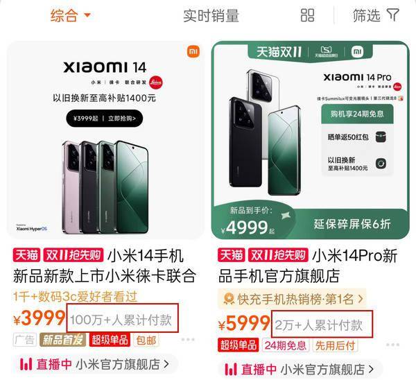 从上述数据也可以发现,小米14的热度要明显高出小米14 Pro不少。即使按照购买一台手机包含预订和付尾款两次付款计算,小米14在开售1小时内光天猫旗舰店就卖出了50万台以上,而这还是最保守的估算,实际表现可能比这一数字更多。
