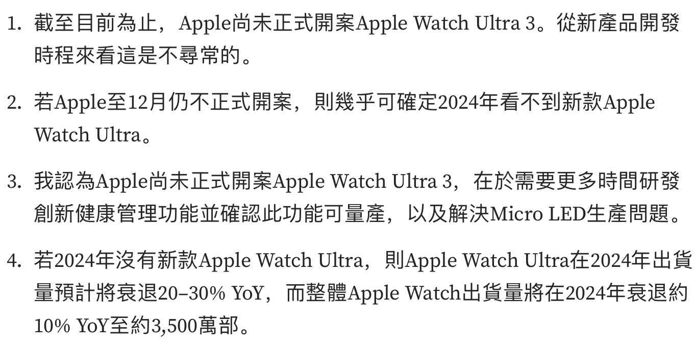 - Apple Watch Ultra 在明年的出货量将同比下滑 20%-30%