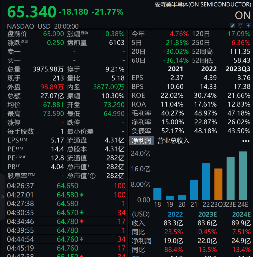 然而,安森美称由于电动汽车的市场需求量萎缩,芯片需求也相应减少,这导致第四季度预期收入不超过20.5亿美元。此外,尽管今年以来已经裁员1360人,但安森美计划继续裁员900人。受上述消息影响,安森美股价当日大跌21.77%,几乎抹去了2023年以来的年内累计升幅,收报于每股65.34美元。