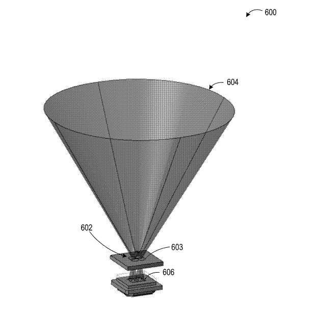 图6示出了一种眼成像摄像头600,它包括包含四个透镜的超材料透镜阵列602,其中一个如图603所示。每个透镜配置为将类似视场604的图像聚焦到图像传感器606,但由于透镜阵列602的每个透镜的不同位置,可以从稍微偏移的角度进行聚焦。
