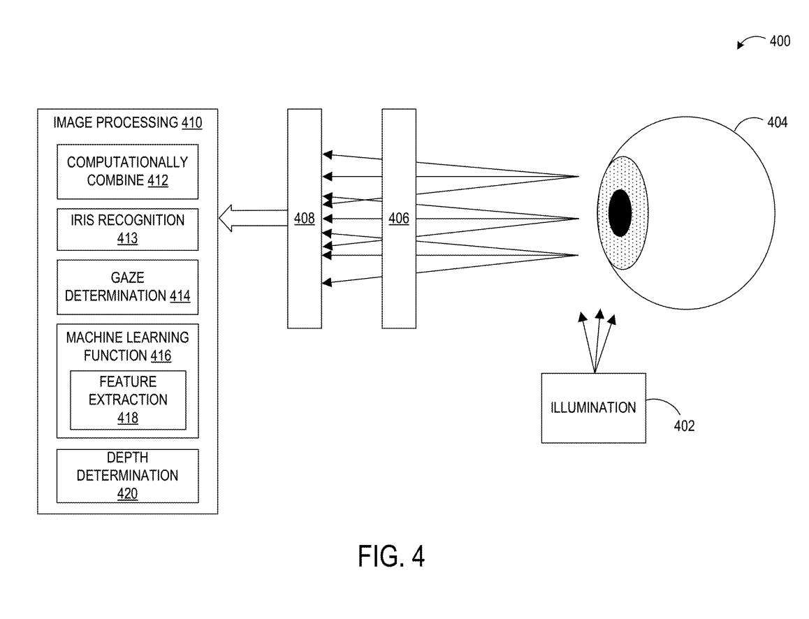 图像捕获到的眼睛不同视角可以进一步提供深度信息。与使用传统透镜系统(例如透镜系统302)相比,这种深度透视可以减少用于眼动追踪的闪烁光源的数量,因为在执行注视点追踪时,有时需要使用更多数量的闪烁光源来获得更深度的透视。