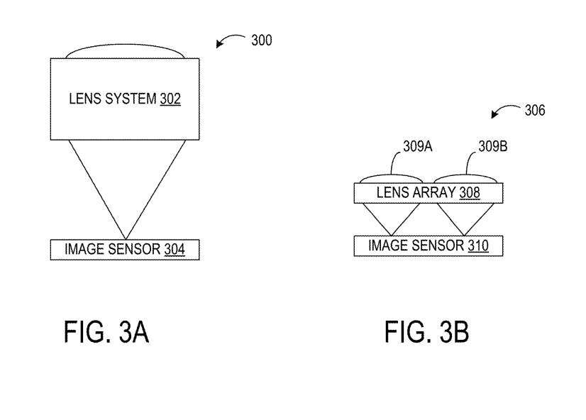 包含透镜阵列的照摄像头则如图3B的306所示。在摄像头306中,透镜阵列308的每个透镜309A、309B将相应的图像聚焦到图像传感器310的不同区域。如上所述,透镜309A、309B可以在公差范围内对齐,并且每个透镜可以产生类似的图像。