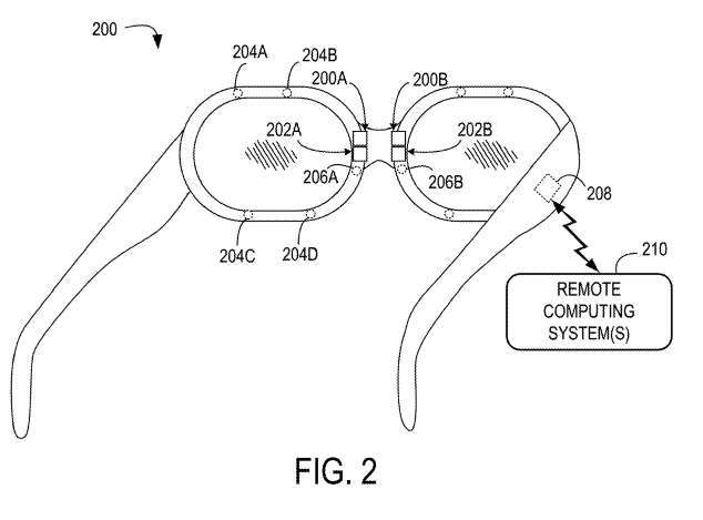 图2示出近眼设备。近眼设备包括眼动追踪摄像头200A、200B和虹膜识别摄像头202A、202B。