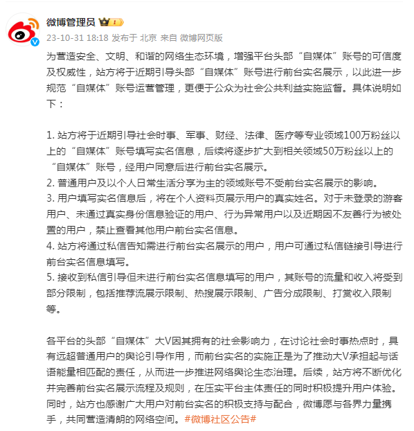各平台的头部“自媒体”大V因其拥有的社会影响力,在讨论社会时事热点时,具有远超普通用户的舆论引导作用,而前台实名的实施正是为了推动大V承担起与话语能量相匹配的责任,从而进一步推进网络舆论生态治理。后续,站方将不断优化并完善前台实名展示流程及规则,在压实平台主体责任的同时积极提升用户体验。同时,站方也感谢广大用户对前台实名的积极支持与配合,微博愿与各界力量携手,共同营造清朗的网络空间。