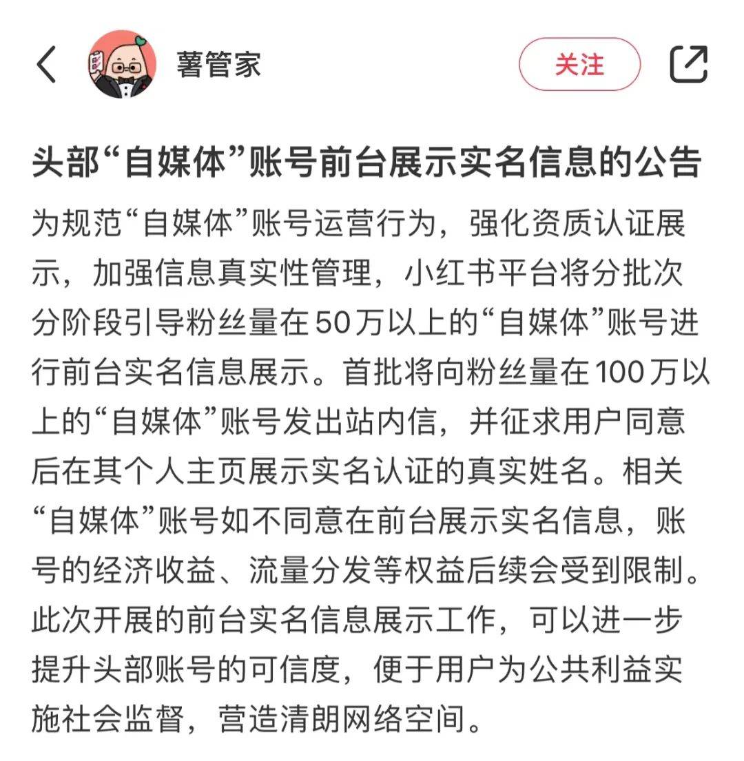 小红书官方账号“薯管家”发布公告,小红书平台将分批次分阶段引导粉丝量在50万以上的“自媒体”账号进行前台实名信息展示。首批将向粉丝量在100万以上的“自媒体”账号发出站内信,并征求用户同意后在其个人主页展示实名认证的真实姓名。相关“自媒体”账号如不同意在前台展示实名信息,账号的经济收益、流量分发等权益后续会受到限制。