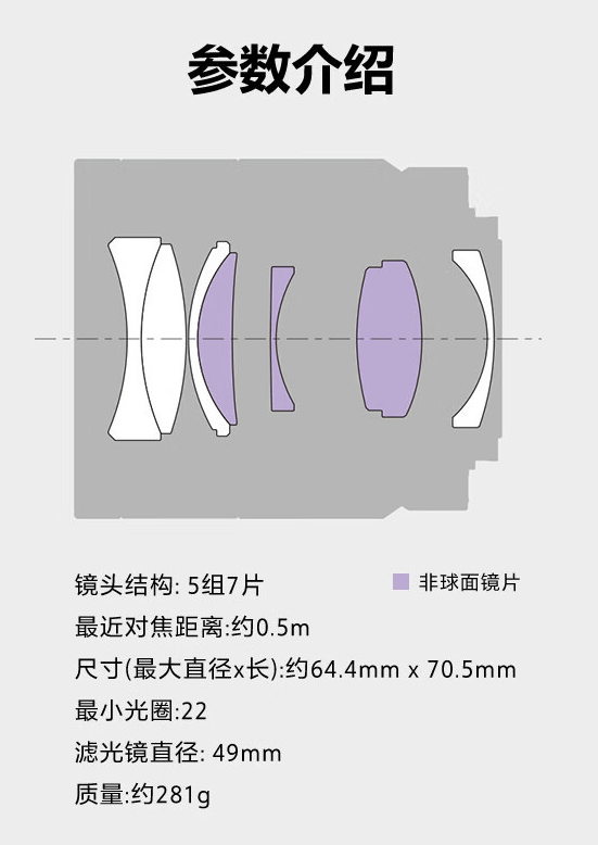 该镜头重量约 281g,采用 F1.8 大光圈,搭载 5 组 7 片镜片,包含 3 枚非球面镜片,最近对焦距离约 0.5m。