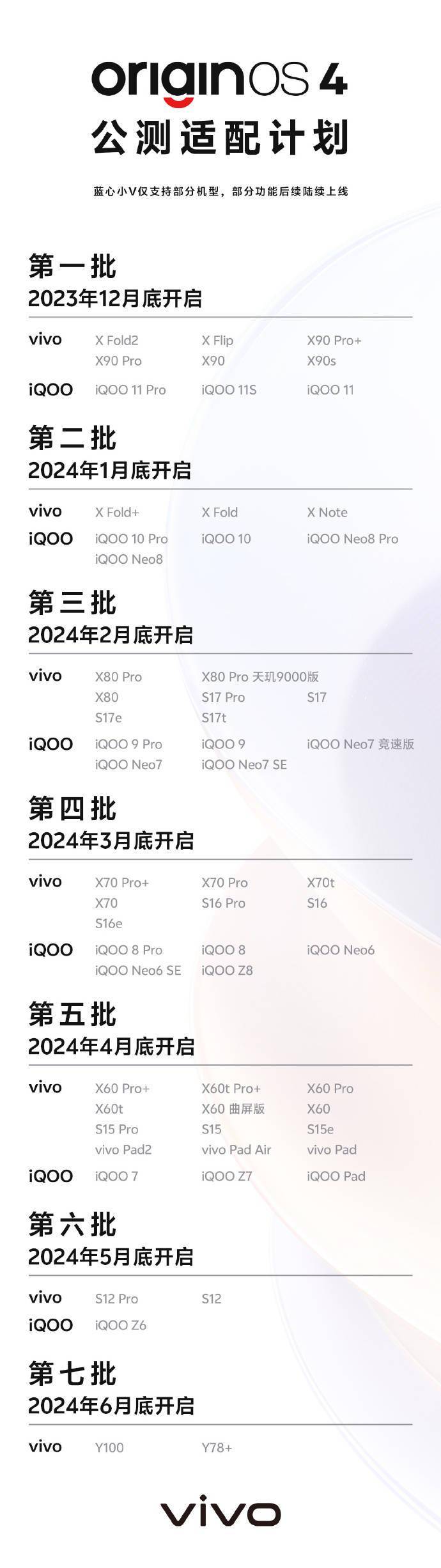 鞭牛士 11月1日消息,vivo发布全新系统OriginOS 4公测适配计划,X100、iQOO 12将首发搭载OriginOS 4,其余机型公测计划如下。内测推送将于明日开启。据悉,此次origin OS 4公测适配将分为7个批次,第一批将于2023年12月底开始,最后一批将于2024年6月适配陆续结束。