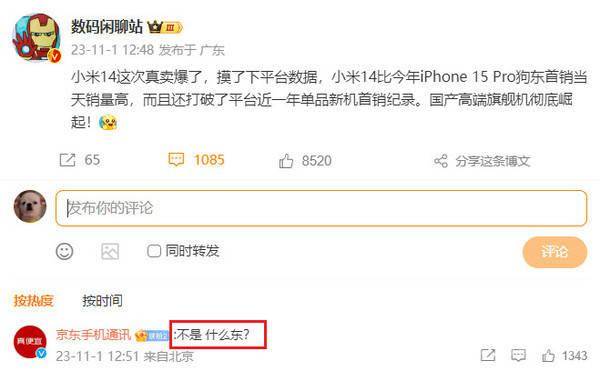 除此之外,还有一个亮点。该博主在微博上调侃京东为“狗东”,引起了近来十分活跃的京东官博账号的注意。@京东手机通讯 官方在该微博下面评论称:“不是 什么东?”