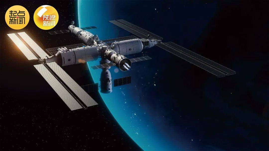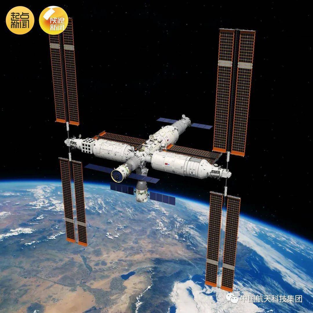 (中国空间站三舱“T”字基本构型示意图,左侧为问天实验舱,右侧为梦天实验舱,中间由近及远分别为神舟飞船、天和核心舱、天舟飞船,下方为神舟飞船)