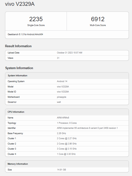 IT之家 11 月 1 日消息,日前,一款型号为 V2329A 的 vivo 新机现身 Geekbench 跑分平台,预计为 iQOO 12 Pro 手机。