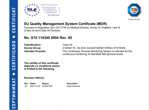欧盟MDR认证是欧盟医疗器械上市的强制性认证,其涵盖了对医疗器械的设计、制造、标签、使用说明、储存、记录和临床评估等方面的严格要求。获得MDR认证意味着硅基仿生的持续葡萄糖监测系统在技术、质量和安全性方面均达到了欧盟的严格标准,也标志着该产品能充分满足欧盟市场对该品类的高技术、高质量要求。MDR认证的获批,帮助硅基持续葡萄糖监测系统为全球糖尿病患者提供先进的血糖监测解决方案铺平了道路。