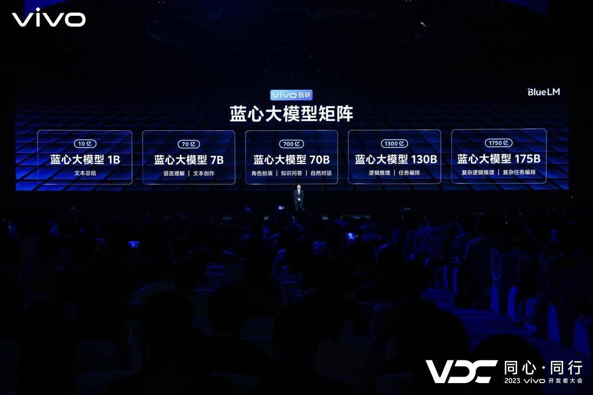 主会场上,vivo副总裁、OS产品副总裁周围发布了“1+2+N”的智能系统体验。其中的1,即vivo自研通用大模型矩阵——蓝心大模型BlueLM;2,即系统全局智能辅助应用“蓝心小V”和以公版APP形式推出的自然语言对话机器人“蓝心千询”;N,即开发者依托vivo业界首家开源的70亿蓝心大模型和对应的微调框架以及大模型开发套件BlueKit打造的高效、低成本专属大模型。1+2+N,将为用户和开发者带来行业领先的智能化体验。