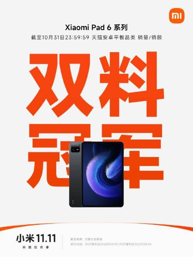 此外,小米平板官方微博还公布了一份战报,数据显示,截止10月31日23:59:59,小米平板6系列在天猫安卓平板品类中获得了销量和销售额的双冠军。