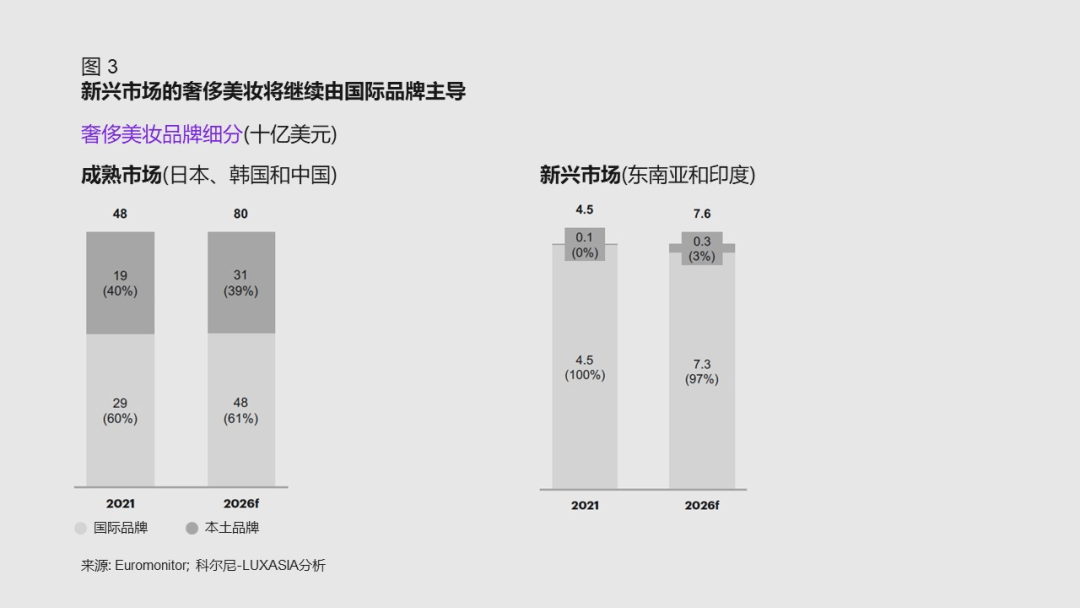 我们相信,这些快速增长的东南亚和印度奢侈美妆市场将继续由国际品牌主导。在成熟市场,本土品牌的市占率高达40%(参见图3)。相比之下,新兴市场上本土奢侈品牌的市占率要低得多。
