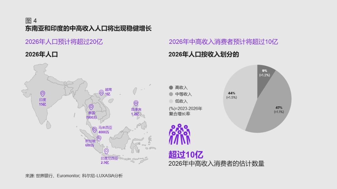 处于这一发展阶段的国家通常拥有规模可观且仍在迅速增长的中产阶级群体。随着东南亚和印度经济的成熟,更多消费者的经济阶层会上升,从大众消费迈向奢侈消费。预计到2026年,该地区中产阶级及高收入阶层的总消费者规模将超过10亿(参见图4)。