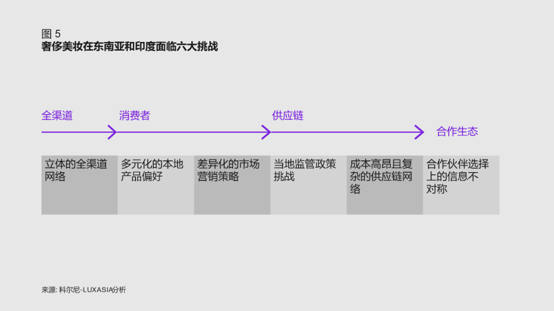 由于市场环境的多样性,在东南亚和印度实现增长仍然是一项棘手的任务。品牌在这个多元化及碎片化的地区将面临六大挑战(参见图5),这意味着,增长战略不能一刀切。