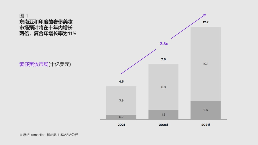 尽管中国、日本和韩国是国际品牌的必争之地,但未来10年的黄金机会窗口将是正在迅速崛起的东南亚和印度市场。到2026年,东南亚和印度的奢侈美妆市场潜力预计将达到76亿美元,与2021年的45亿美元相比,年复合增长率为11%,这意味着平均每两年就有约10亿美元的新增奢侈美妆消费市场规模。