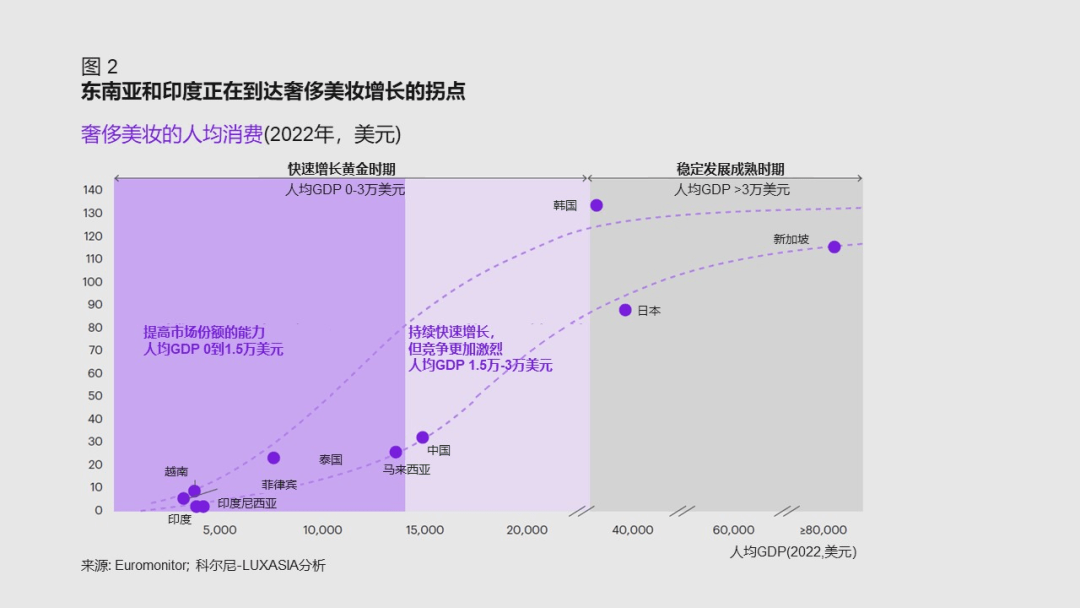 我们的研究还显示,东南亚和印度正接近一个拐点,并有望在奢侈美妆领域享受10年的两位数增长(参见图2)。这些市场条件触发了本土美妆品牌的激增,这些品牌往往主打大众价位段的细分市场;对于国际品牌,奢侈美妆细分市场则成为发展机会。