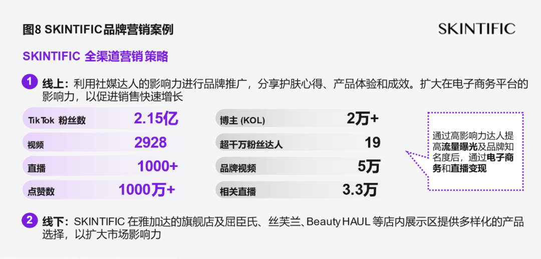 SKINTIFIC通过双管齐下的线上线下品牌营销打法,迅速在东南亚消费者心目中占领了“健康护肤”的品牌心智(参见图8)。同时,SKINTIFIC采取KOL营销打法,与10万~1000万粉丝的博主广泛合作,从而成功吸引和触及各类型消费者,高效宣传其高性价比产品。
