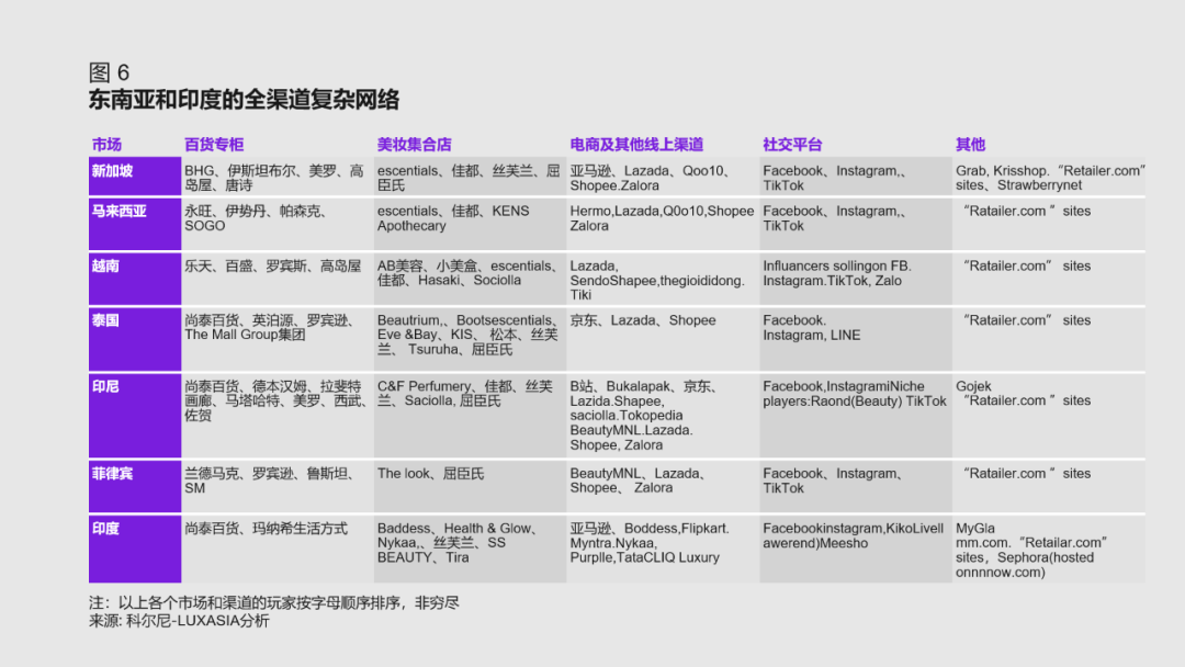 现今,奢侈购物的需求已经演变为包含线下零售、线上电商和社交平台等业态的综合需求。由于各个市场的平台与渠道各有不同,使得这一在线消费生态系统更加错综复杂。图6详尽地展现了东南亚和印度的全渠道网络复杂性。