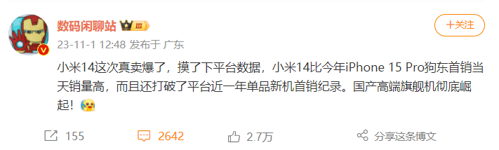 因此在11月1日小米14系列的首销量就成为全网热议的焦点,说什么的都有。但在这一天还传出一个大消息。知名大V数据闲聊站表示:小米14这一次真卖爆了。原因是他摸了一下平台的数据,发现小米14比今年iPhone 15 Pro京东首销当天的销量都要高,而且打破了平台近一年单品新机首销纪录。于是他感叹到“国产高端旗舰彻底崛起”