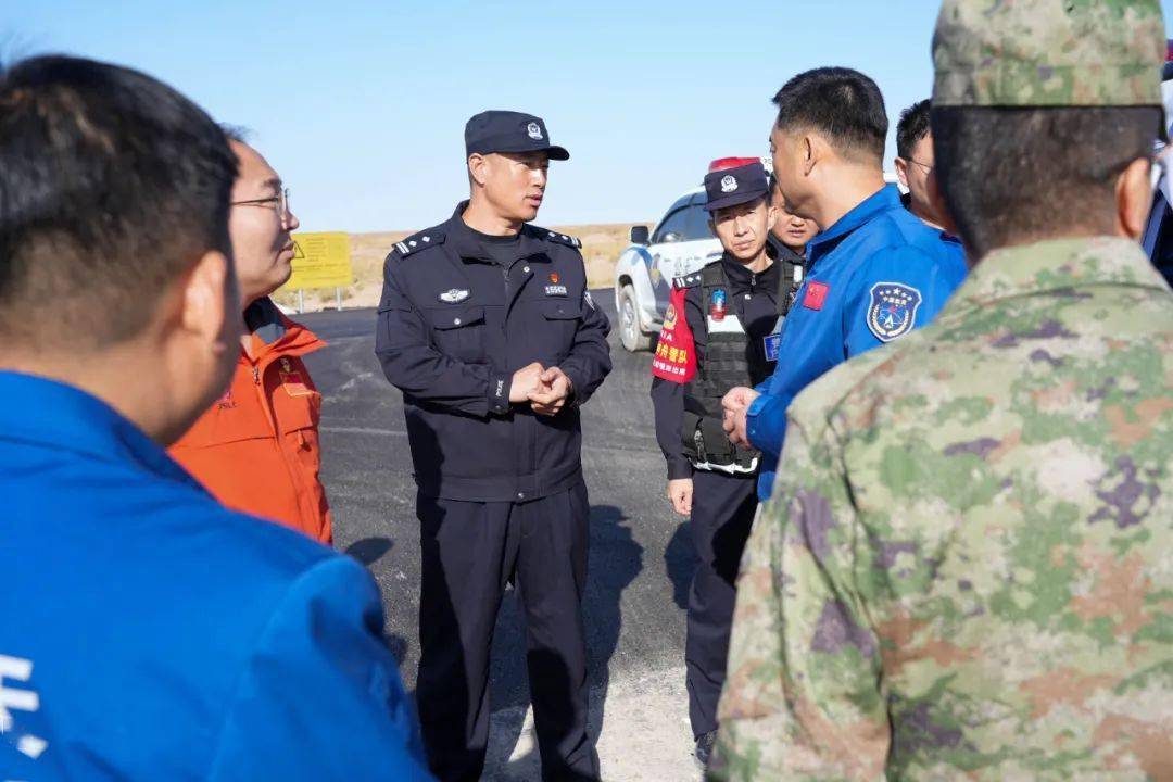 “看,神舟十六号返回舱!”在东风着陆场核心区域周边执勤的民警辅警们相继望向返回舱着陆方向。
