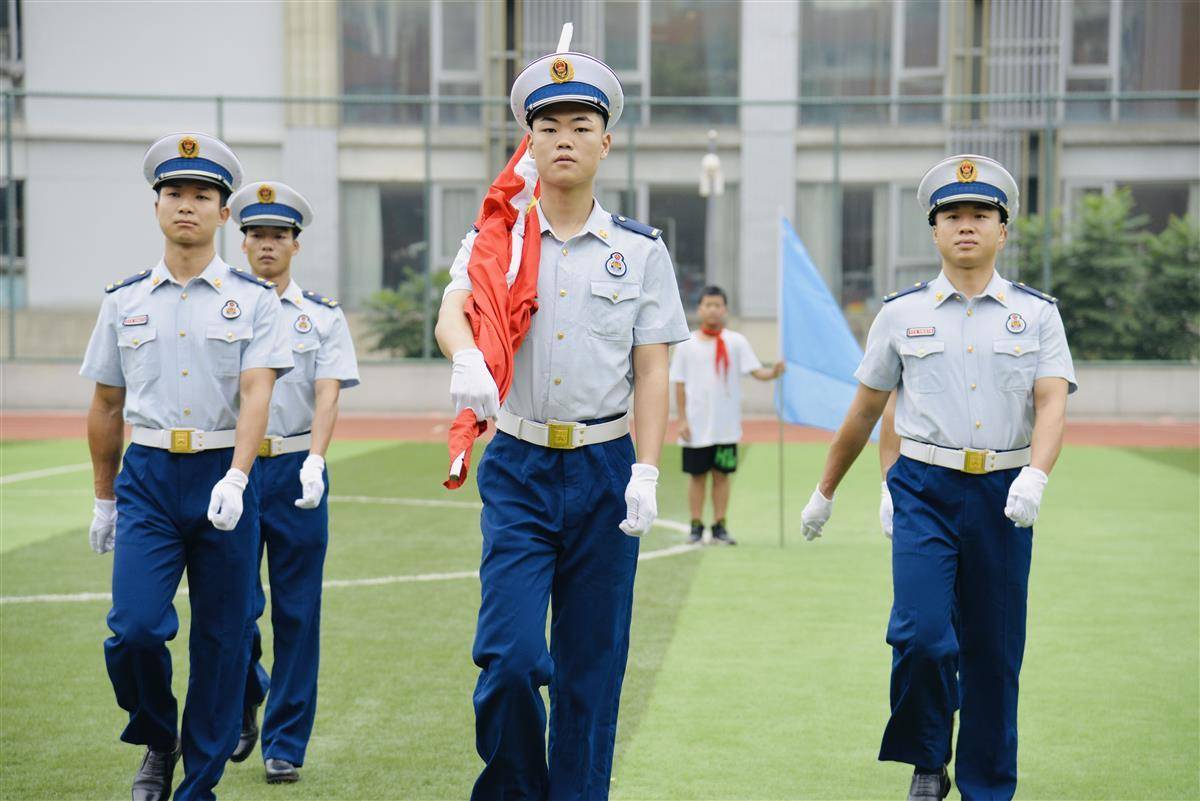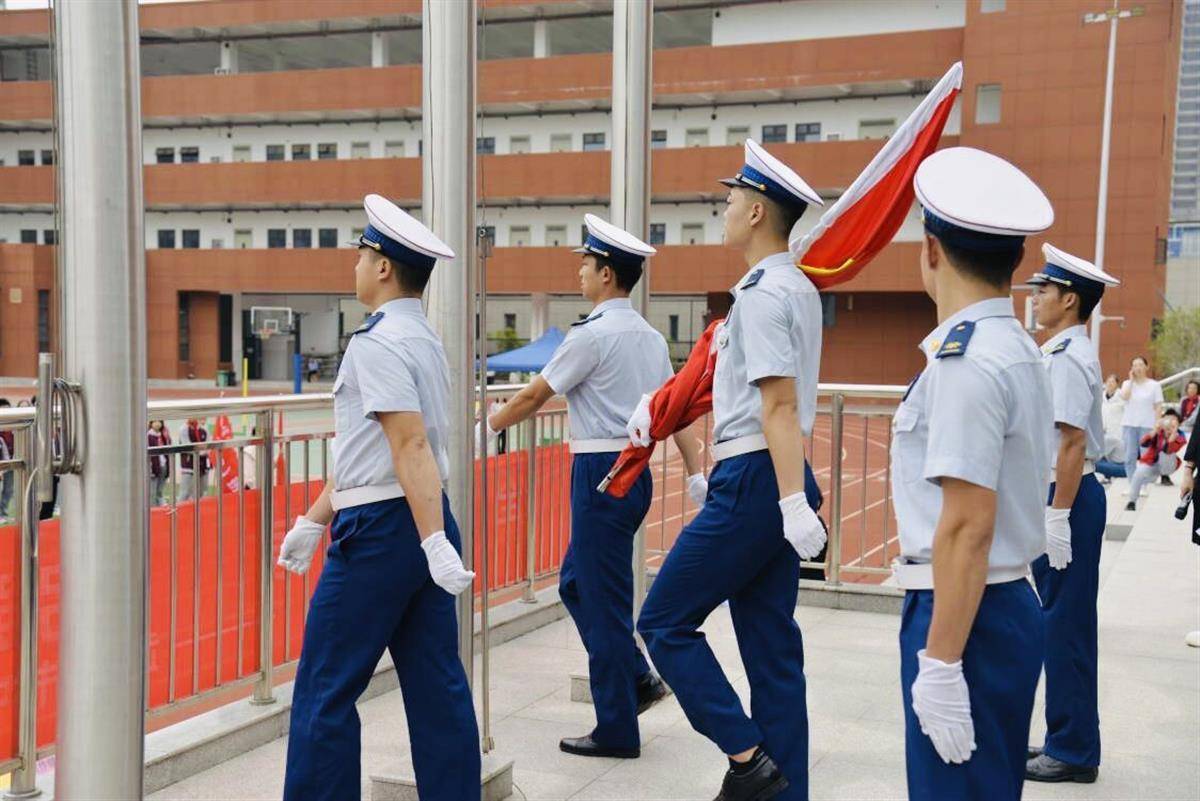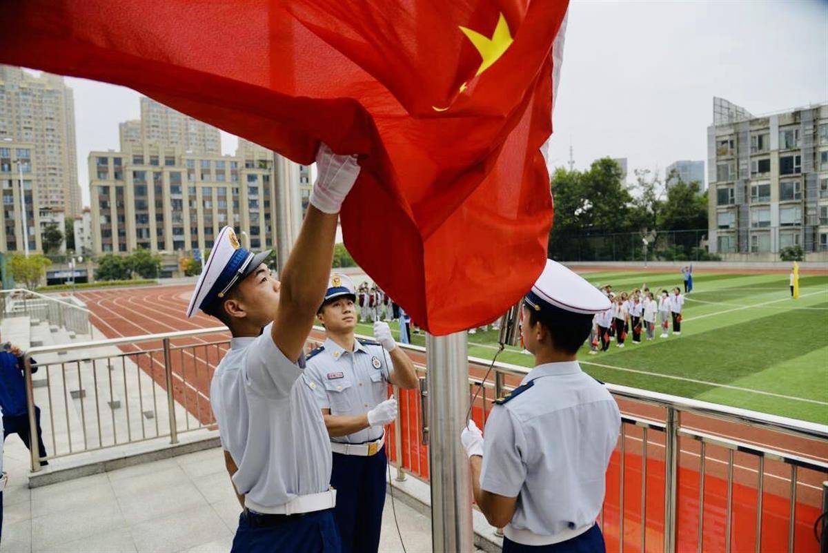消防员们着装整齐,身姿定形定位,尽显严谨细致的作风与严明的工作纪律。一声令下,他们迈着矫健的步伐,将鲜艳的五星红旗护送入场。国歌响起,旗手将鲜艳的五星红旗铿锵有力地抛向空中,当熟悉的那一抹红随风展开时,师生以最标准的姿势向国旗敬礼,雄壮的《义勇军进行曲》萦绕在每个人的心中。