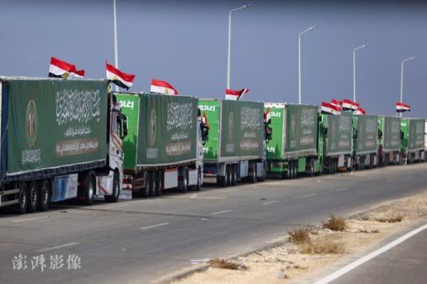 当地时间10月31日,埃及拉法口岸,载有援助物资的车辆将进入加沙地带。图自澎湃影像