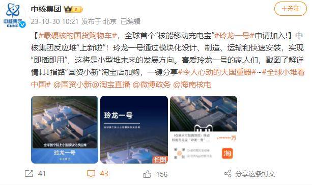 全球最大直径竖井掘进机、全球最大吨位桥面吊机、全球首创1.2万米特深井自动化钻机、全球首创干喷湿纺大丝束产品,还有被称为“移动核能充电宝”的全球首个陆上模块化小型核反应堆“玲龙一号”……赶在天猫双11,国企央企国家队在淘宝集中上架了新一批“大国重器”。