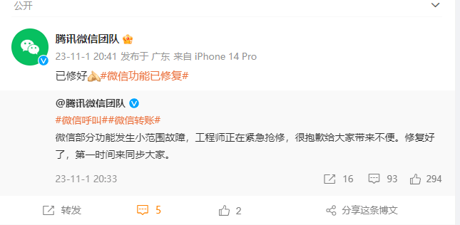 IT之家 11 月 1 日消息,腾讯微信团队微博表示,微信部分功能发生小范围故障,工程师正在紧急抢修。