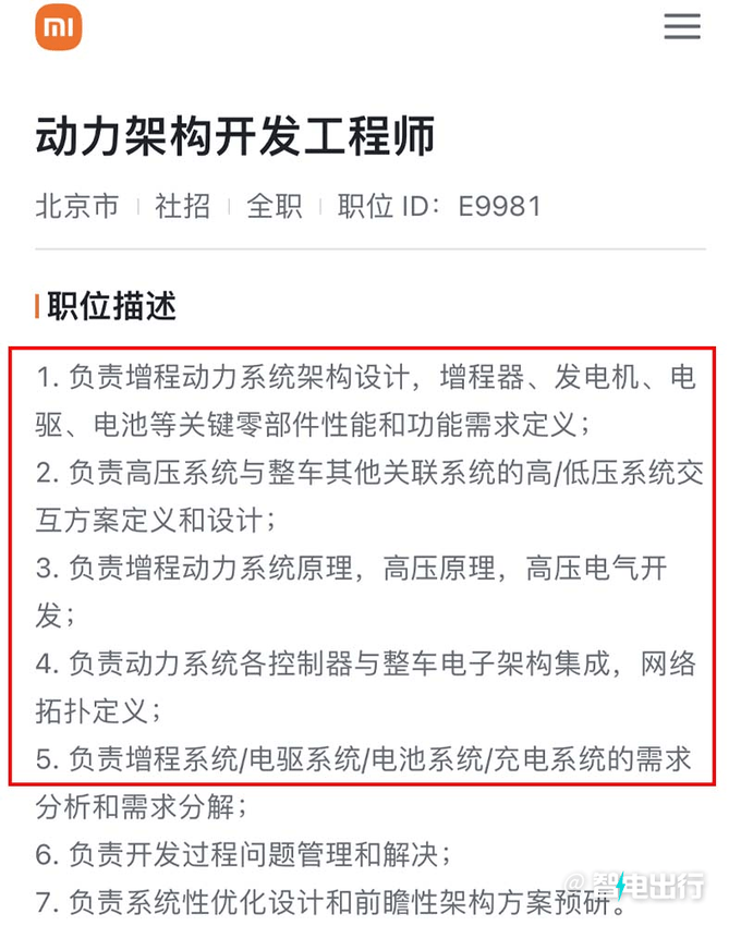 智电出行了解到,小米汽车正在招聘增程系统设计开发、燃油系统、排气系统等相关工程师,这意味着小米汽车除了提供纯电动力外,还有望推出增程版。