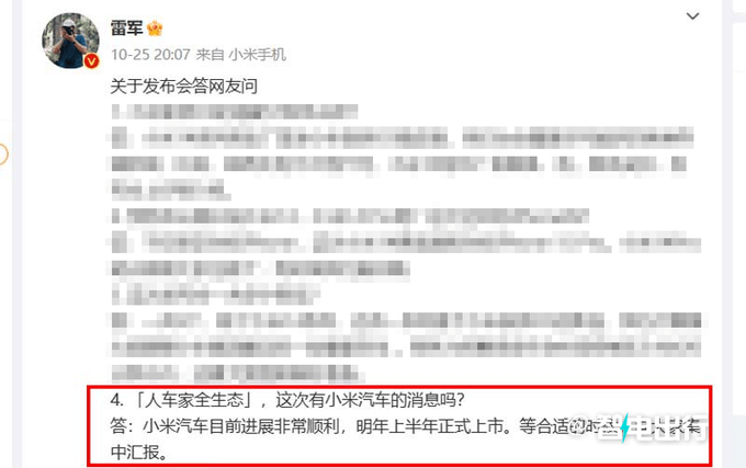 10月25日,小米创办人,董事长兼CEO雷军在个人社交平台表示:小米汽车目前进展非常顺利,明年上半年正式上市。