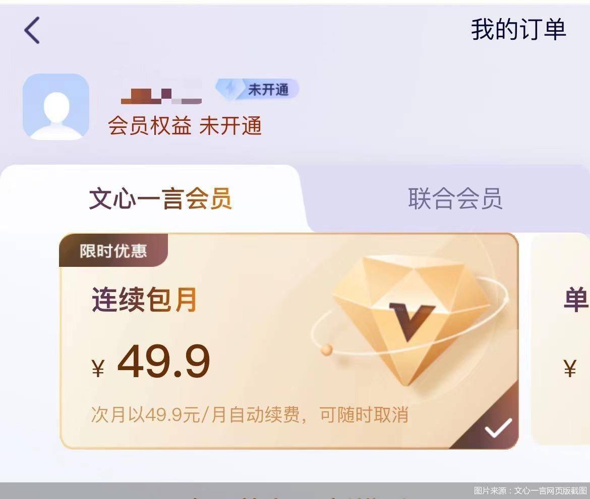 在价位上,文心一言会员提供连续包月49.9元/月,单月购买59.9元/月两种选择,联合会员价是99元/月。