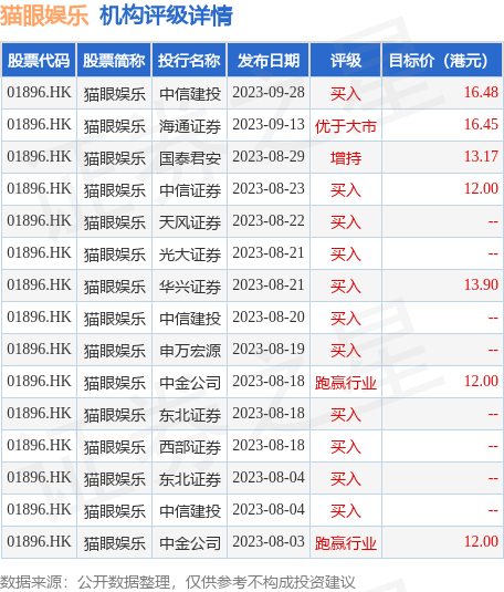 截至2023年11月1日收盘,猫眼娱乐(01896.HK)报收于9.32港元,下跌0.75%,换手率0.17%,成交量197.66万股,成交额1836.46万港元。投行对该股的评级以买入为主,近90天内共有11家投行给出买入评级,近90天的目标均价为13.71港元。中信建投最新一份研报给予猫眼娱乐买入评级,目标价16.48港元。