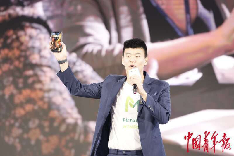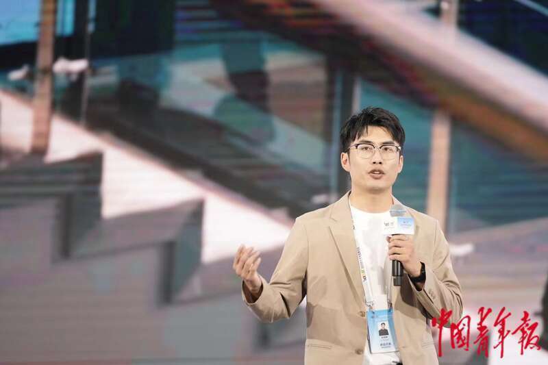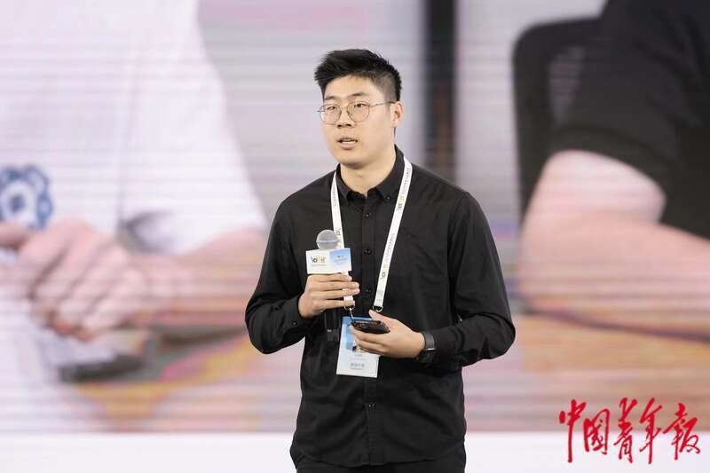 10月31日,北京首钢园,2023年世界青年发展论坛青年数字发展主题论坛闪电发言环节,中国杭州问尔信息技术公司项目负责人王振阳介绍如何利用手机和人工智能技术帮助年轻人塑造更好的自我。中青报·中青网记者 李隽辉/摄