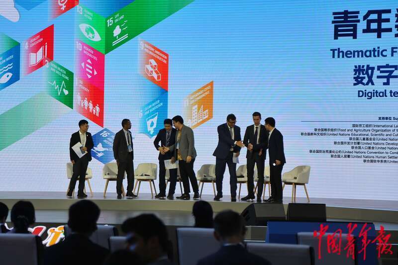 10月31日,北京首钢园,2023年世界青年发展论坛青年数字发展主题论坛青年对话环节,来自多国的青年代表、国际组织驻华机构代表围绕青年如何以数字技术助力实现联合国可持续发展目标进行探讨。中青报·中青网记者 李隽辉/摄