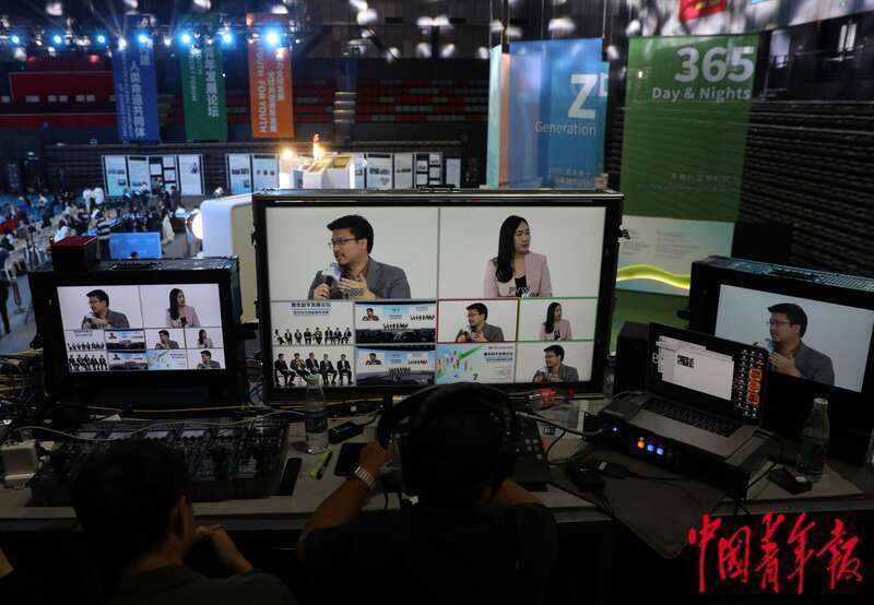 10月31日,北京首钢园,2023年世界青年发展论坛青年数字发展主题论坛现场,视频直播中控台。中青报·中青网记者 陈剑/摄