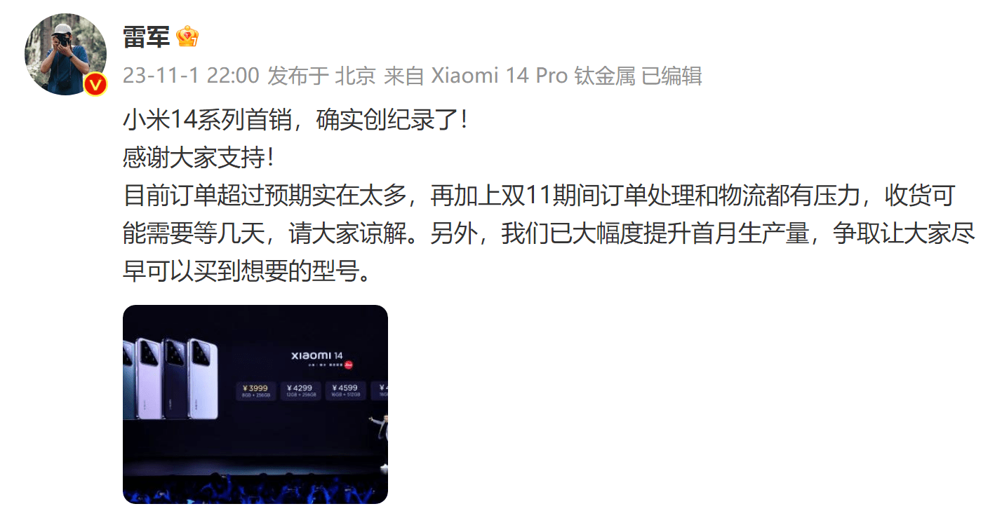 11月1日晚,小米创始人雷军在个人微博上发文,确认小米14系列销售创纪录:
