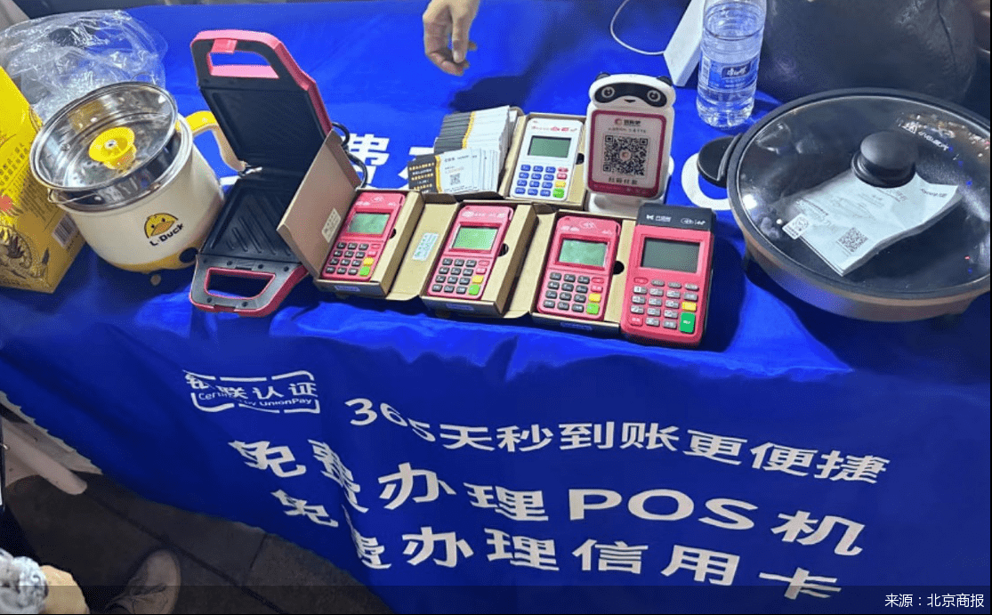 北京一处夜市摊上,一家“免费办理信用卡、免费办理POS机”的摊位格外引人注目,和POS机一同向个人消费者展示的,还有早餐机、蒸蛋器、炒锅等礼品,吸引不少消费者驻足。“我们都是这么干的,这样才能拉到新客。”代理商王悦(化名)告诉北京商报记者。