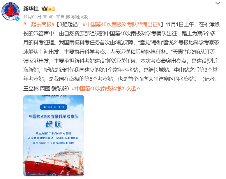 11 月 2 日消息,据新华社报道,11 月 1 日上午,由自然资源部组织的中国第 40 次南极科学考察队出征,本次征程为期 5 个多月。