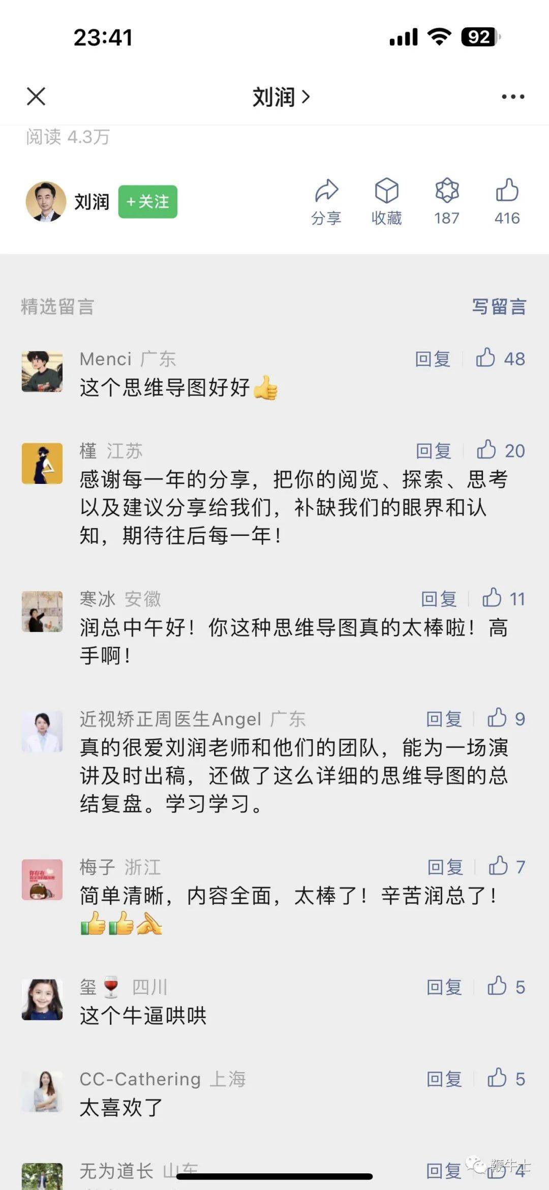 有意思的是,评论已经全部隐藏。第四次回应:视频回应。在刘润老师的地盘,高赞第一竟然是支持提出质疑问题的折扣牛CEO马昕彤。
