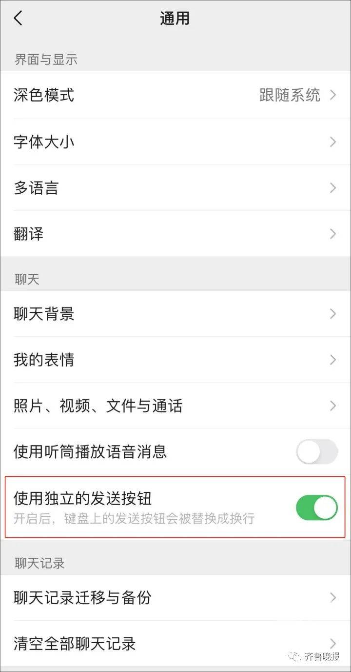 更新后在【微信】-【我】-【设置】-【通用】-【使用独立的发送按钮】,默认关闭,手动开启后,键盘上的发送按钮就会替换成换行。