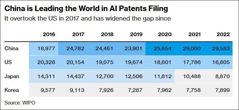 彭博社的报道,近日,世界知识产权组织给出了一组数据,在A专利方面,中国的领先优势正逐渐扩大。在去年的一年时间里,中国申请的AI专利数量已经是美国的两倍。2022年一年,中国申请了29853项AI相关专利,占全球AI专利申请量的40%,而美国仅有16805项。在这我们要先知道一点,那就是和前年相比,中国的AI专利数量在不断上升,美国却在同比下降。至于其他国家,比如说日韩的话,他们两国加起来才和美国一样。想超过中国,不好意思,他们连中国的影子都看不到。