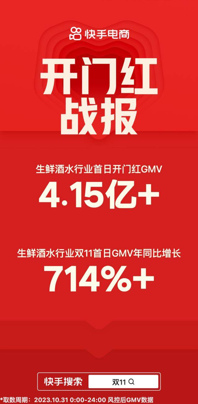 10月31日,双11预售期结束,进入大促正式期销售战场。在用户购物需求集中爆发下,快手电商生鲜酒水行业双11首日迎来“开门红”,31日单日GMV破4.15亿,年同比增长超714%,酒水、生鲜、肉禽等类目均展现出高速增长势头。