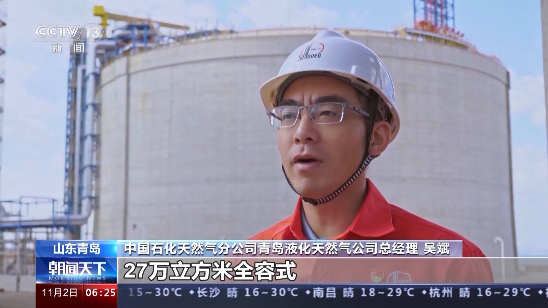 中国石化天然气分公司青岛液化天然气公司总经理 吴斌:这座储罐的顺利投用,也使青岛LNG(液化天然气)接收站年接转能力提升至1100万吨、年供气能力突破至165亿立方米,正式迈入千万吨级LNG(液化天然气)接收站行列。