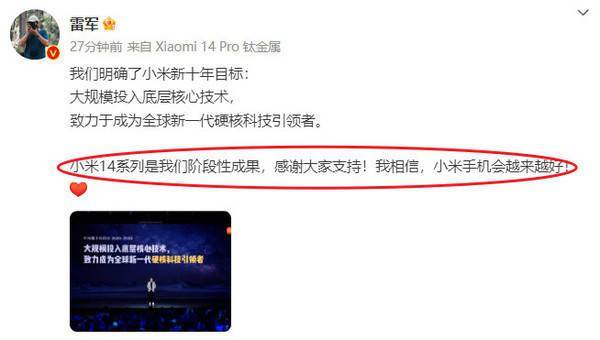 【手机中国新闻】小米14系列正式开售后销售非常火爆。11月2日,小米创办人,董事长兼CEO雷军发微博称,小米14系列是我们阶段性成功,我相信,小米手机会越来越好。
