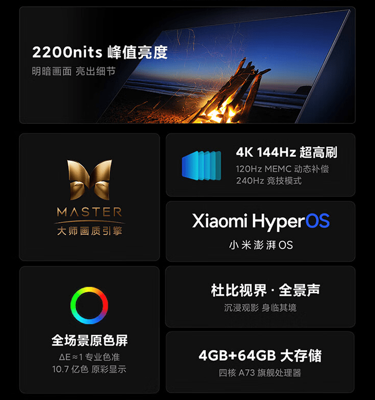 游戏方面,支持AMD Freesync Premium Pro,2ms超低延迟,支持WiFi 6,有Xiaomi HyperOS系统,4GB内存,64GB存储,电源功率350W。