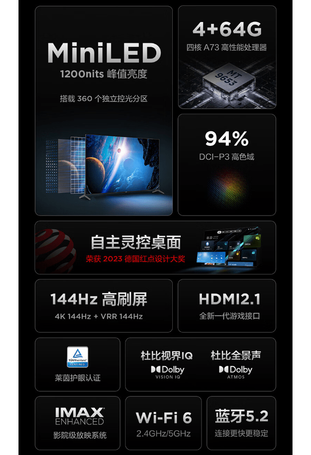 具有4核A73处理器,内存是4GB,存储64GB,支持杜比视界IQ,杜比全景声,还有IMAX ENHANCED,具有40W扬声器,支持WiFi 6,蓝牙5.2。