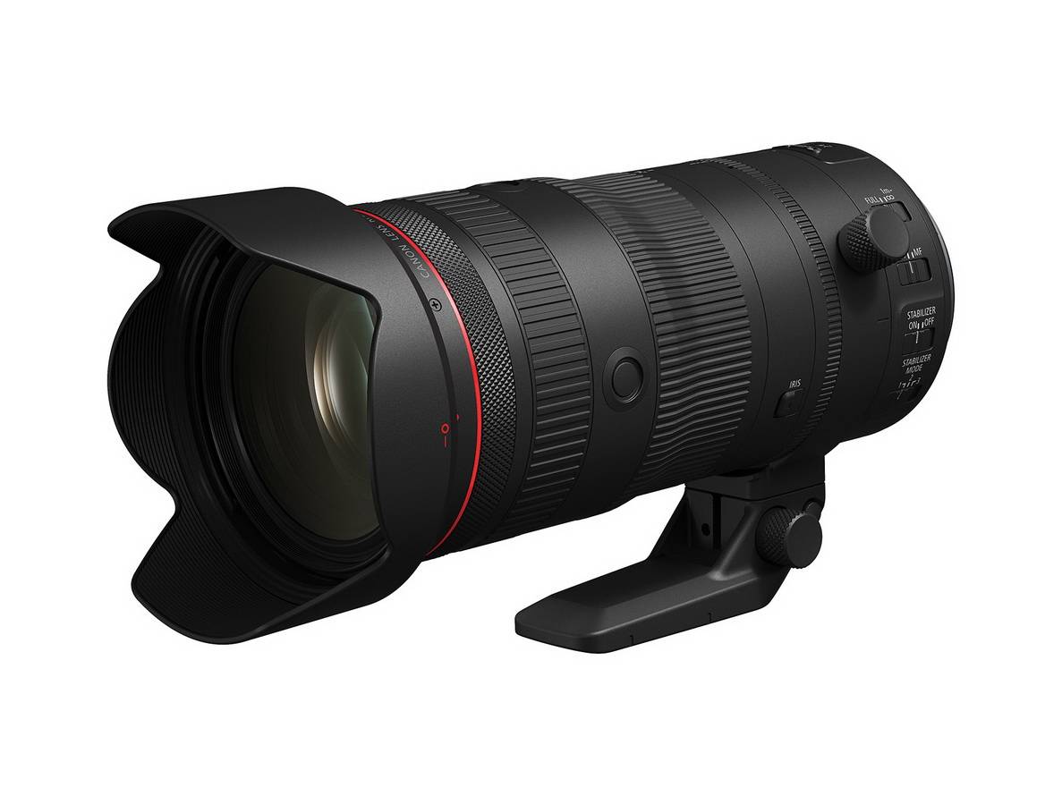 和普通变焦镜头不同,RF 24-105mm F2.8 L IS USM Z使用了内变焦设计,加上在24-105mm焦距上实现恒定F2.8大光圈,因此镜头长度达到199mm,直径89mm,使用82mm螺纹滤镜,重量达到1330g,因此佳能为它配置了一个三脚架支架,镜筒表面还有对焦限位、AF/MF、防抖、防抖模式开关以及自定义按键,配置看齐70-200mm镜头。